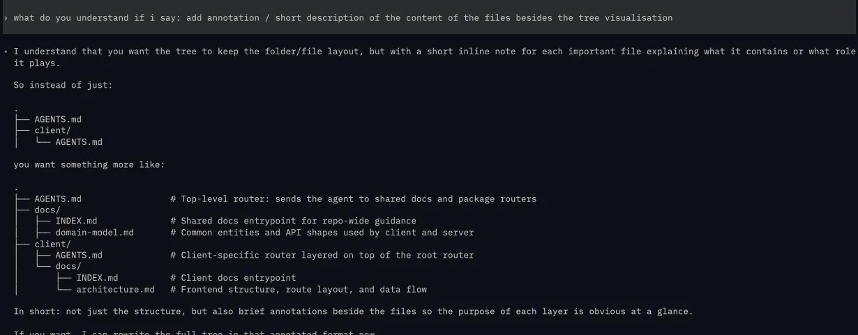 Instead of using AGENTS.md as a context dump for the codebase, treat it as a light weight router. Tell it to refer to a docs folder which contains information about your codebase architecture, style, constraints, rules and so on. The goal is to practice progressive disclosure much like skills. This way we provide the model enough to make its decision and not dump a whole chunk of information to model and hope that it’ll do something correct.